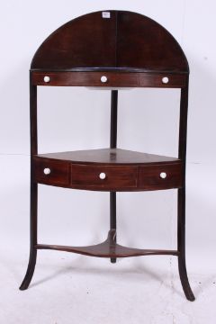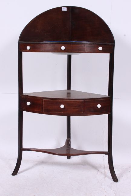 A Georgian mahogany inlaid corner washstand. Squared supports with gallery splash back to the top tier having pierced recesses complete with one enamel bowl