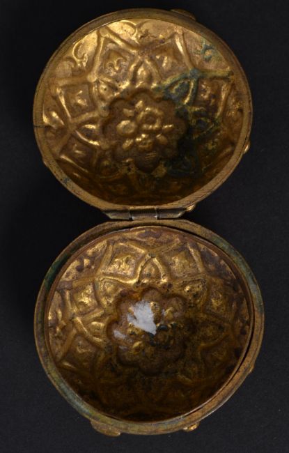 An unusual brass pot / inkwell with inset stone - turquoise and ruby colour