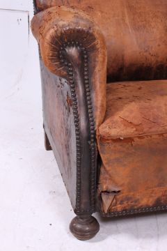 A 1930's Art Deco French Leather Club Armchair raised on bun feet with barrel arms and leather strapped back rest