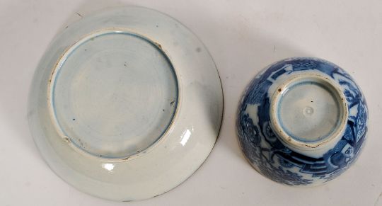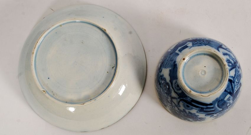 3 19th century blue & white Chinese tea cups and saucers. Decorated with court scenes and foliate backgrounds