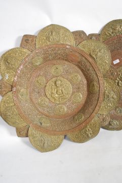 A pair of large 19th century Anglo Indian copper and brass wall chargers. The oversized circular charges adorned with ' petal ' decoration to the sides having scroll worked centre moulded in relief