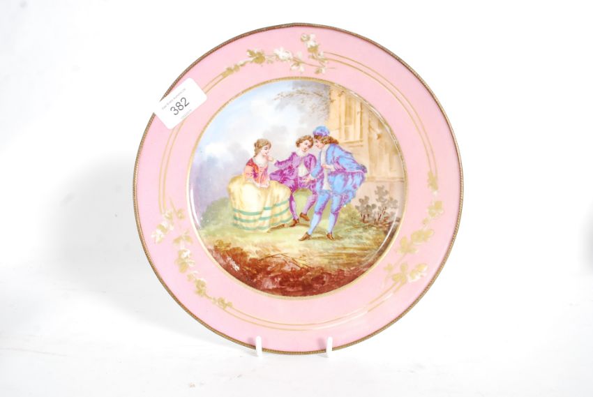 A 19th century continental cabinet plate having pink borders with brass banded border. The central panel stylised with handpainted courtship scene. Unsigned,