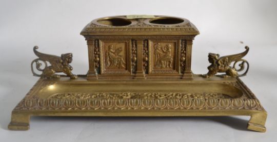 An early 20th century brass desk tidy with lions to sides and heavy detailing to facia.