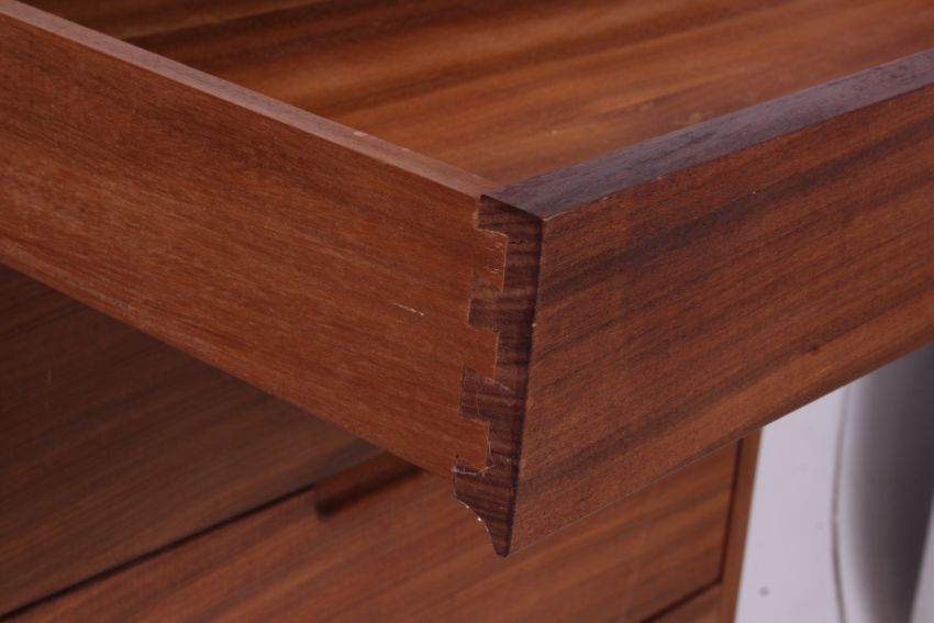 A Danish teak upright pedestal tall chest of drawers in the manner of Ib Kofod Larsen. The squared legs united by stretchers having an upright chest with central bank of drawers being blind fronted with recess handles to lower centre.