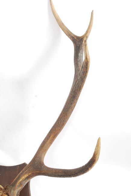 An early 20th century large mounted set of Stag antlers having six points fitted to an armorial shield