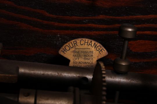An early 20th century Industrial National Time Recorder Co. Ltd oak cased clocking-in recorder, the signed circular dial with Roman numerals, the glazed door above a hinged front enclosing the mechanism. Measures: 99cms x 34cms x 21cms.