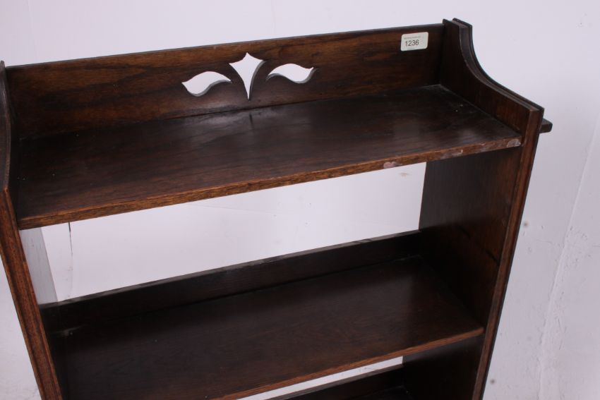 A Victorian arts & crafts oak bookcase. The open window front having pierced and peg uprights with gallery shelf to the top