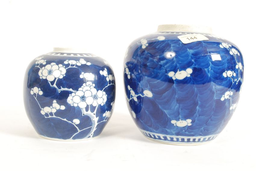 2 19th century Kang-xi Chinese ceramic baluster vases of blue and white form, one with character marks to base, the other with blue concentric circles.