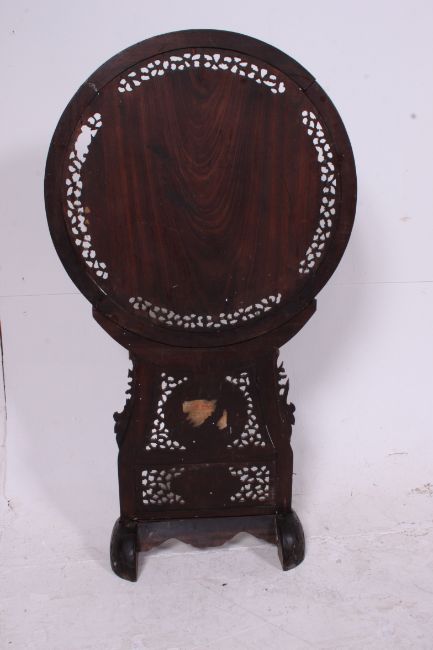A 19th century Chinese Mother of pearl inlaid hardwood table top screen. The base with fret pierced design having stunning circular panel above. each with inlaid mother of pearl design. Measures: 87cms x 48cms x 15cms.