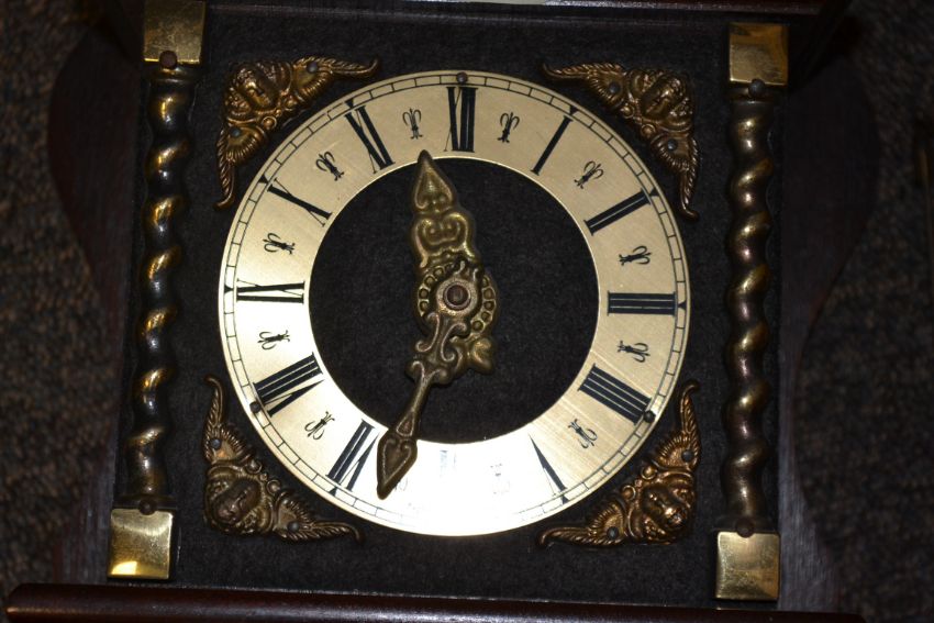 A 20th century mahogany wall hanging gilt decorated clock with chains and weights