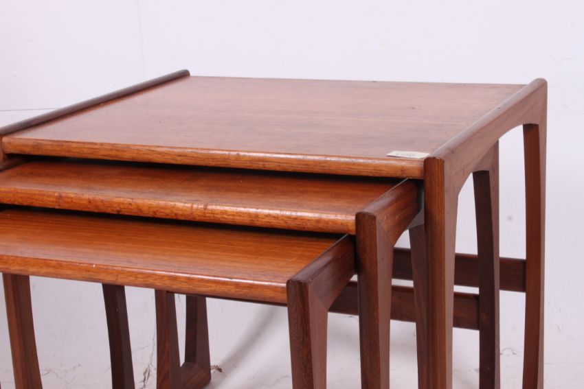 A 1970's retro G-Plan teak wood nest of tables in the Kelso pattern. Raised on squared legs with graduating tops to each