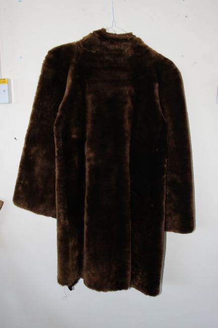 A mid 20th century vintage ladies Persian fur coat circa 1940's, edge to edge collarless. Knee length. Lined interior approx size 12