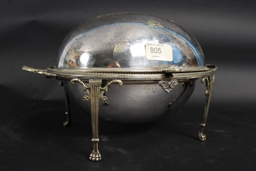 An early 20th century silver plate Breakfast dish of oval form with hinged lid, pierced inner tray all raised on hairy paw feet