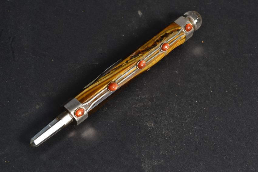 An unusual Chinese silver and agate mineral stone pointed pen. The silver collars surround a polished stone agate centre