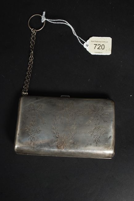 A hallmarked silver ladies purse (marks rubbed) complete with chain and decorated to one side. 148.2g