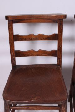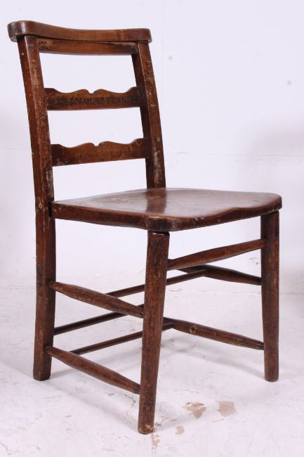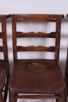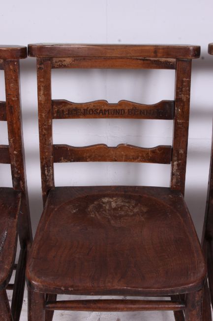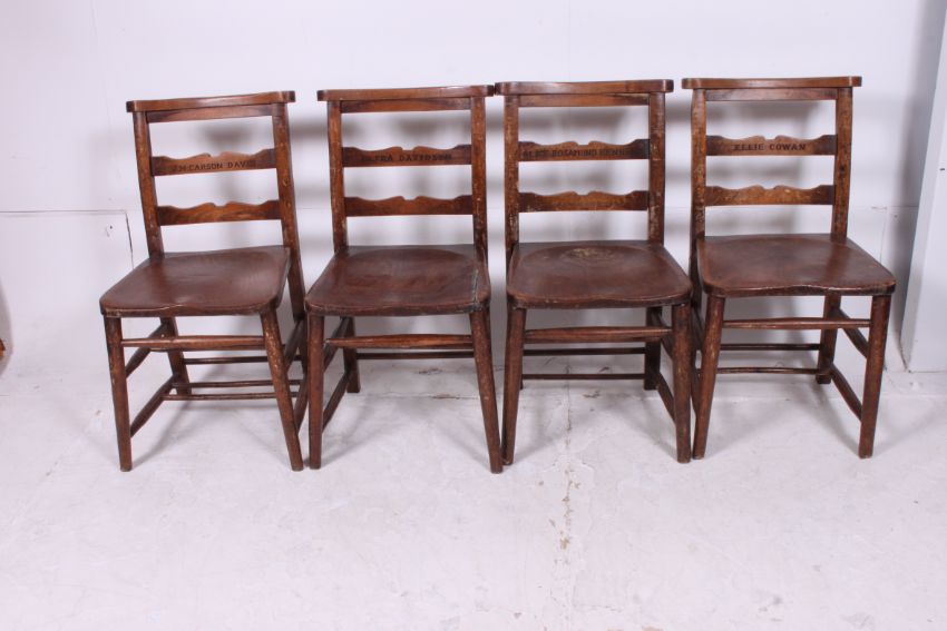 A set of 4 Victorian beech and elm wood chapel / dining chairs each bearing individual names to the back rests. The chair tops with praying top rails over elm seats raised on turned supports. Measures: 79cms x 40cms x 40cms.
