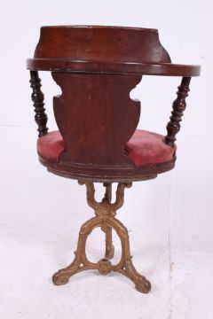 A Victorian cast iron and mahogany captains office ships swivel chair. Raised on a gilt cast iron base with upholstered seat with mahogany back rest