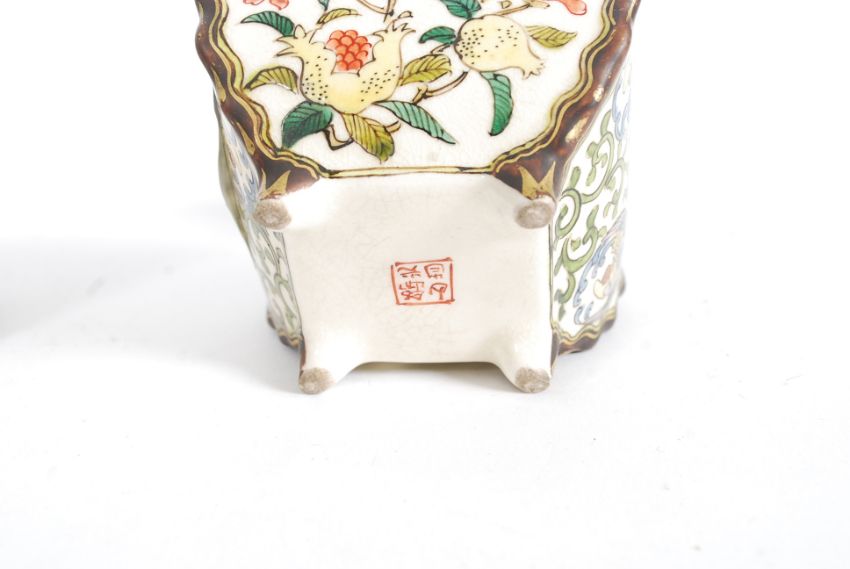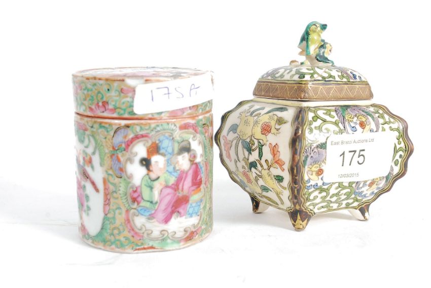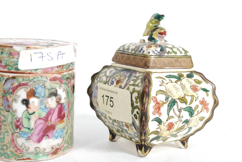 A Chinese / Japanese miniature ginger jar stylised with fruit and vines bearing character marks to the base together with a Cantonese / Canton jar and lid