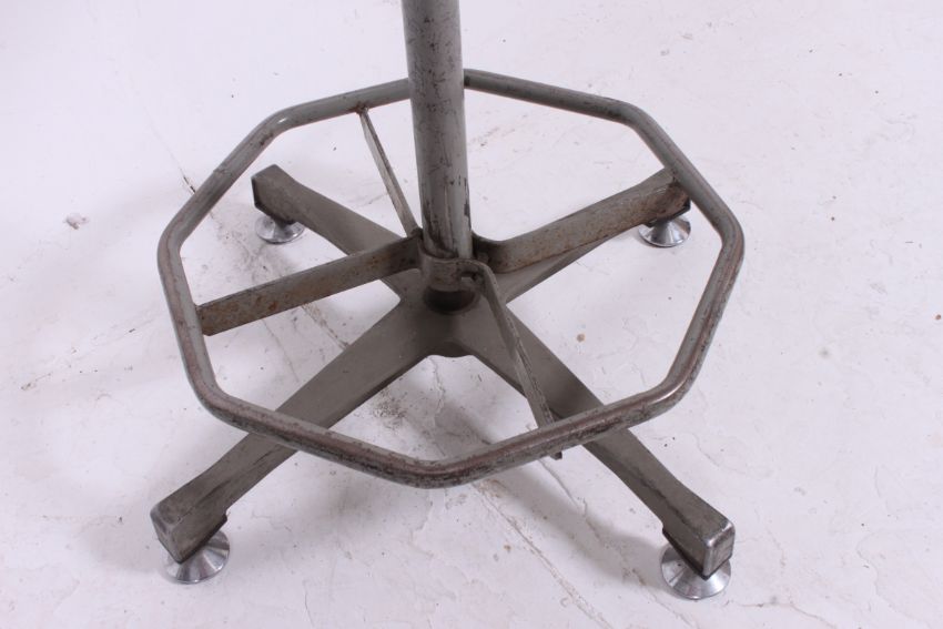 A good 1950's metal enamel painted grey Industrial machinists / typists clerks swivel desk chair raised on quadruped base with swivel action. Measures: 107cms H x 46cms D.