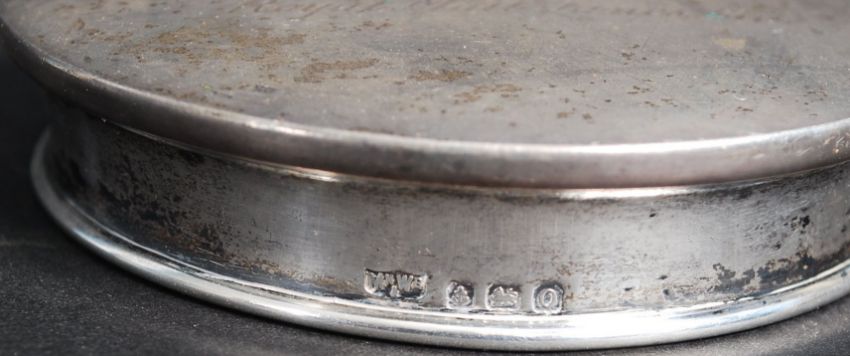 A Royal Mail Shipping Line Silver hallmarked lid, bearing insignia and notation atop. 54.9g