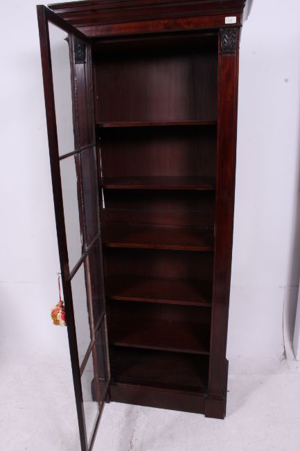 A good Victorian tall mahogany library bookcase cabinet having plinth base with full length astragal glazed door having flared cornice atop, adjustable shelves within