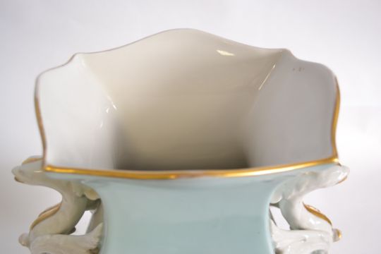 A large early 20th century Staffordshire style vase, with large hand painted front panel depicting a hunting scene.