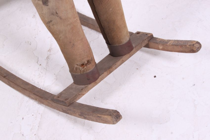 A vintage rocking horse, circa 1950's having original cord upholstery raised over the original wooden glider