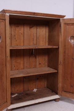 A fabulous painted pine French bread cupboard raised on bun feet with twin doors having brass mesh vents beneath flared cornice atop. inset pine shelves set within. Measures 145cms high x99cms wide x 45cms depth