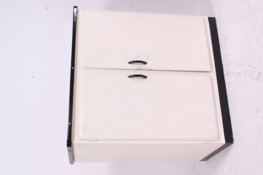 A retro vintage 1950's enamelled metal top kitchen dresser cabinet. The wooden body with twin doors having enamel metal top above. Measures: 80cms x 77cms x 46cms.
