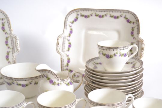 A Royal Doulton tea service having a good chintz foliate pattern comprising cups, saucers, plates etc, pattern no E9996. Measures: tray 23cms.