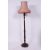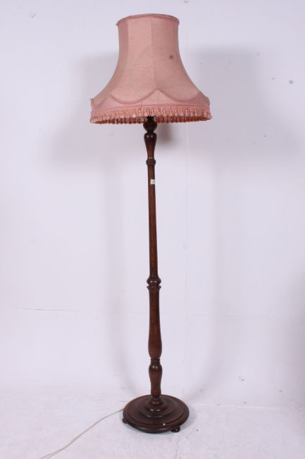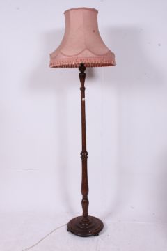 A 1930's mahogany standard lamp raised on terraced base complete with large fabric shade Measures: 200cms H.