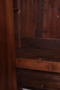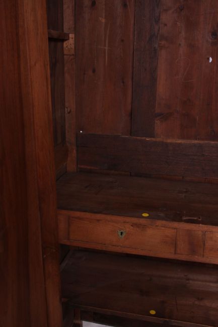 A 19th century French fruitwood armoire double wardrobe. Raised on bracket feet 2 full length doors enclosing adjustable shelves within. FInished with a flared edge top above. Dismantles completely for ease of movement / tight stairways etc.Measures 137cms wide x 220cms high x 60cms depth