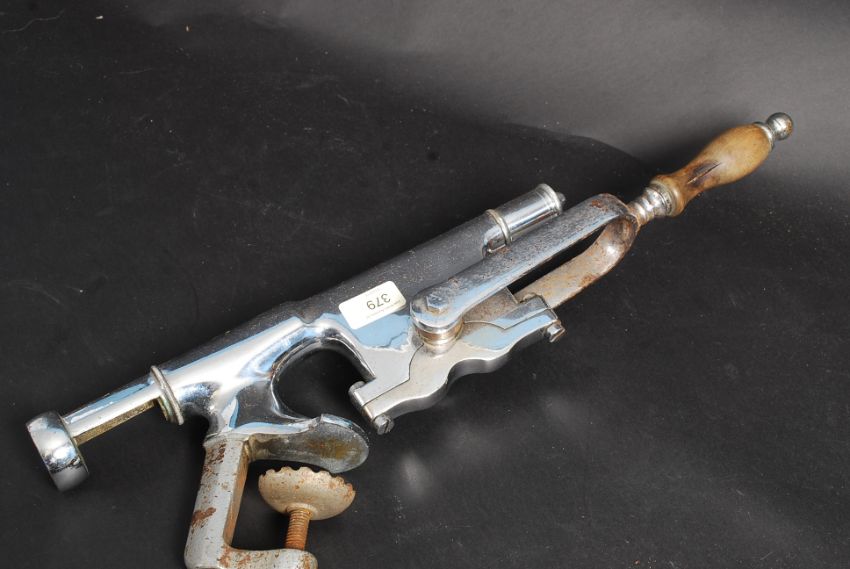 A vintage early 20th century bar mounted chromed brass corkscrew having wooden pull and clamp grip