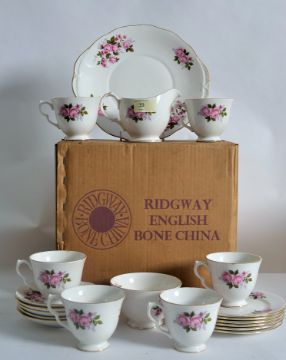 A vintage boxed ( unused ) Queen Anne chintz pattern porcelain tea set complete in the original box. Measures: 27cms.