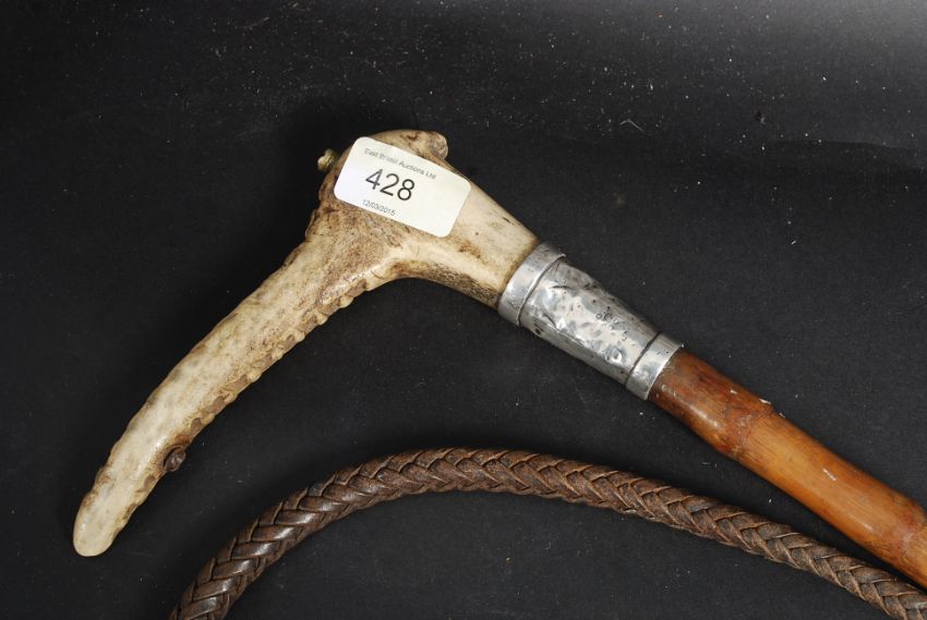 A hallmarked silver banded riding crop with horn handle and whip to base.