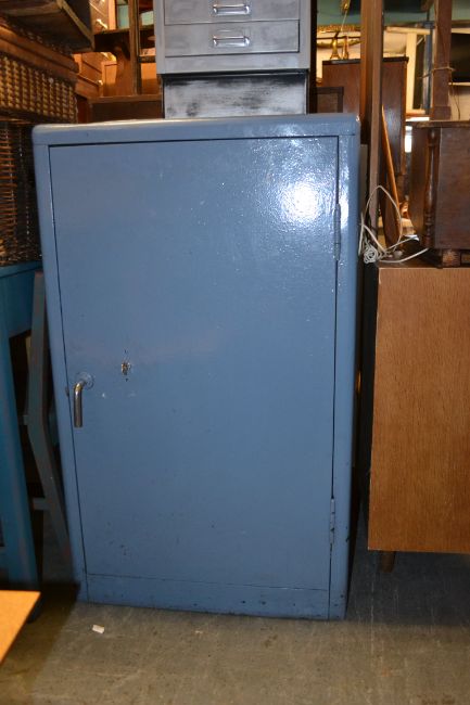 A vintage industrial metal painted safer / locker maintaining original key and heavy handle