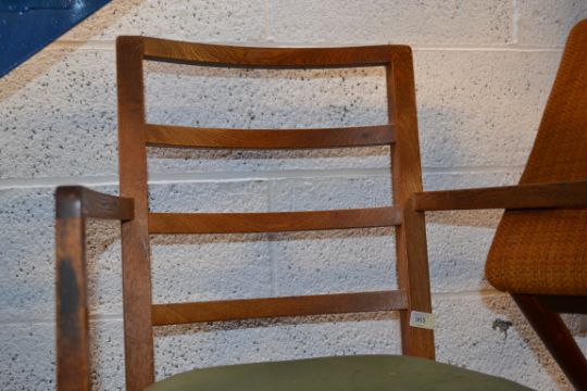 A Gordon Russell oak armchair. Raised on squared legs united by stretchers having drop in seat with angular arms