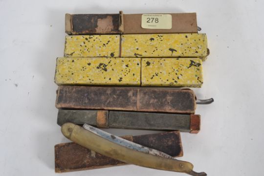 A collection of 5x vintage razors and original leather strop