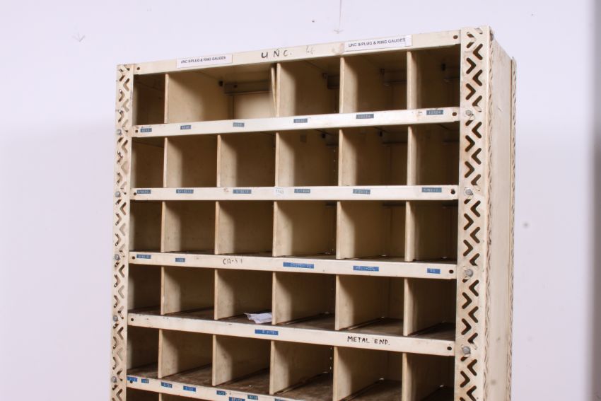 An original mid 20th century Industrial large white painted enamel metal upright cubby cabinet. These white examples with trellis style sides. Ex Douglas motorcycle factory, Bristol. Measures: 191cms x 91cms x 31cms.