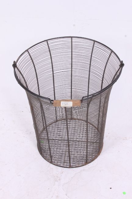 A good 1950's Industrial wire work paper basket bin. Wirework form of waisted design having wooden carry handle atop. Measures: 44cms x 41cms.