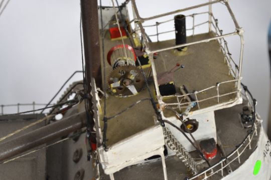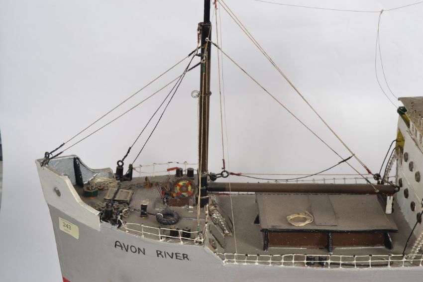 A very good large model boat of a steam tramper in naval grey with red flashing called the Avon Gorge. Complete with rigging and good detailing. Measures: 110cms long.