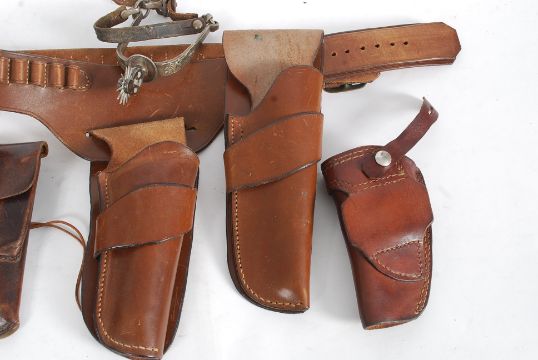 A collection of 20th century leather gun holsters to include American and others , some reproduction - formerly property of ex radio man in Lancaster bomber