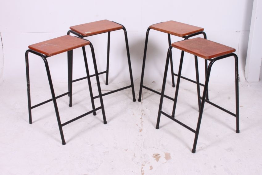A set 4 mid 20th century Industrial laboratory / school stools having ebonised metal tubular supports with pierced panel seats to each. Measures: 59cms x 38cms x 41cms.