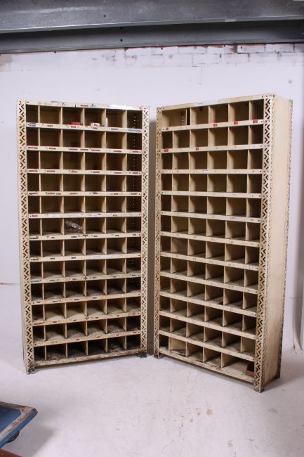 An original mid 20th century Industrial large white painted enamel metal upright cubby cabinet. These white examples with trellis style sides. Ex Douglas motorcycle factory, Bristol. Measures: 191cms x 91cms x 31cms.