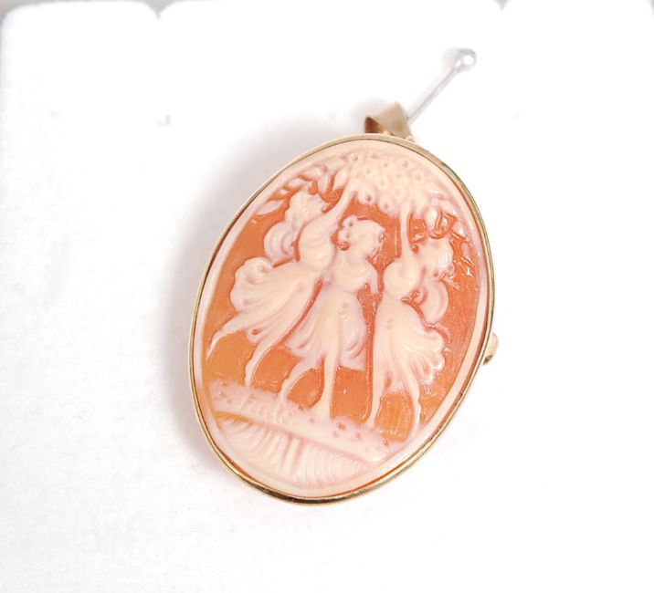 A 9ct gold ladies cameo necklace pendant being hallmarked to the edge having inset 3 graces cameo to centre