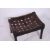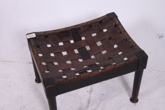 An oak leather weave foot stool. Measures: 30cms x 42cms x 32cms.