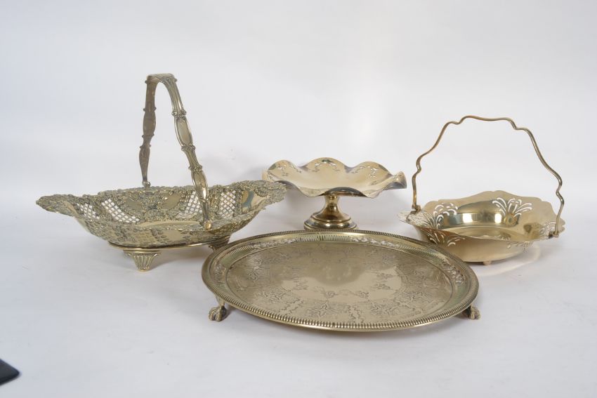 A good early 20th century Edwardian fret pierced bon bon dish with handle. Together with another similar, a pierced tazza and a salver tray ( see illustrations )