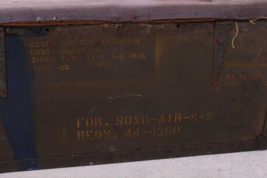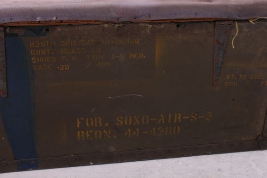 A 20th century military ammunition box / crate being converted to a blanket box having hinged upholstered lid. The crate still bearing military notation in yellow. Measures: 40cms x 88cms x 46cms.
