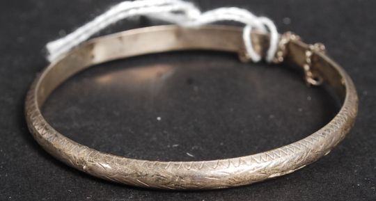 A ladies silver bracelet of simple form having chase decoration being stamped 925. Complete with safety chain . Weight 7.5g