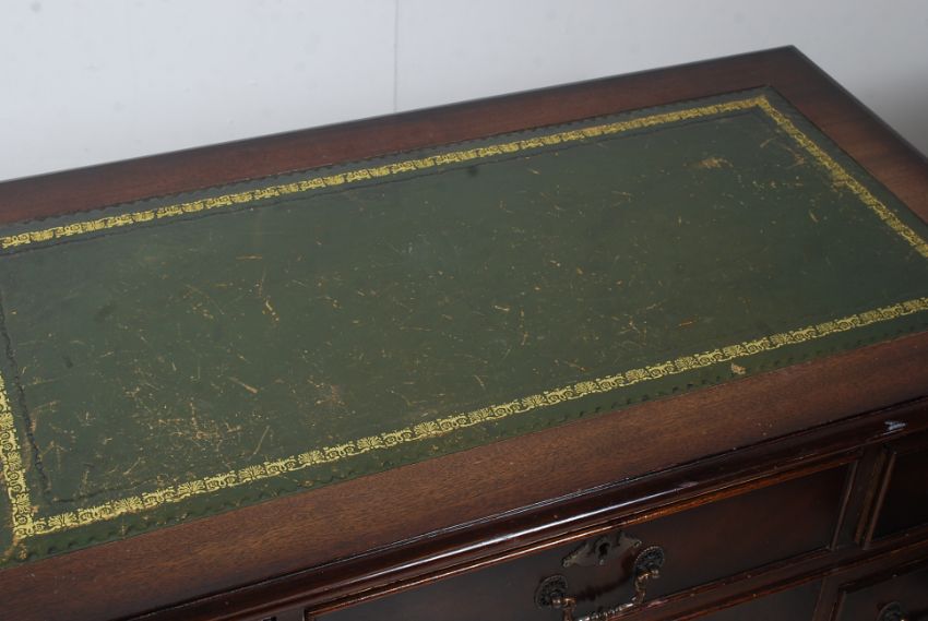 A Georgian style mahogany kneehole pedestal desk raised on bracket feet with a series of drawers to the pedestals and desk top with tooled green leather skiver